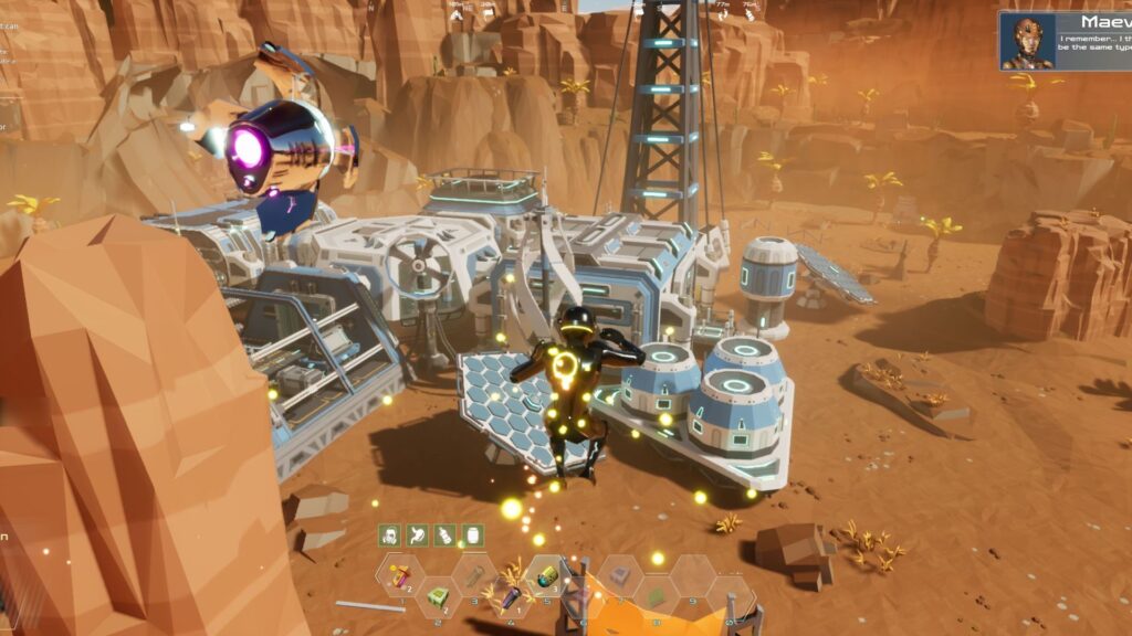 To do so, you’re going to be mining everything. Maeve is accompanied by a cheerful floating orb called Roland, who is equipped with a mining laser, used to blast ore from rocks, uproot vegetation, and gather valuable gems and materials. These rapidly fill your inventory, so you head back to your self-built base (at first essentially a shipping container, and by the end of the game an enormous complex of linked rooms, specialist units, and all manner of benches and machinery) to offload them into containers and processing machines, before heading off once more. The resources are used to build new machines, crafting opportunities and facilities, and the valuables sold to ARC to buy new crafting blueprints, vital upgrades for Roland, and decorative items to make home feel homely.